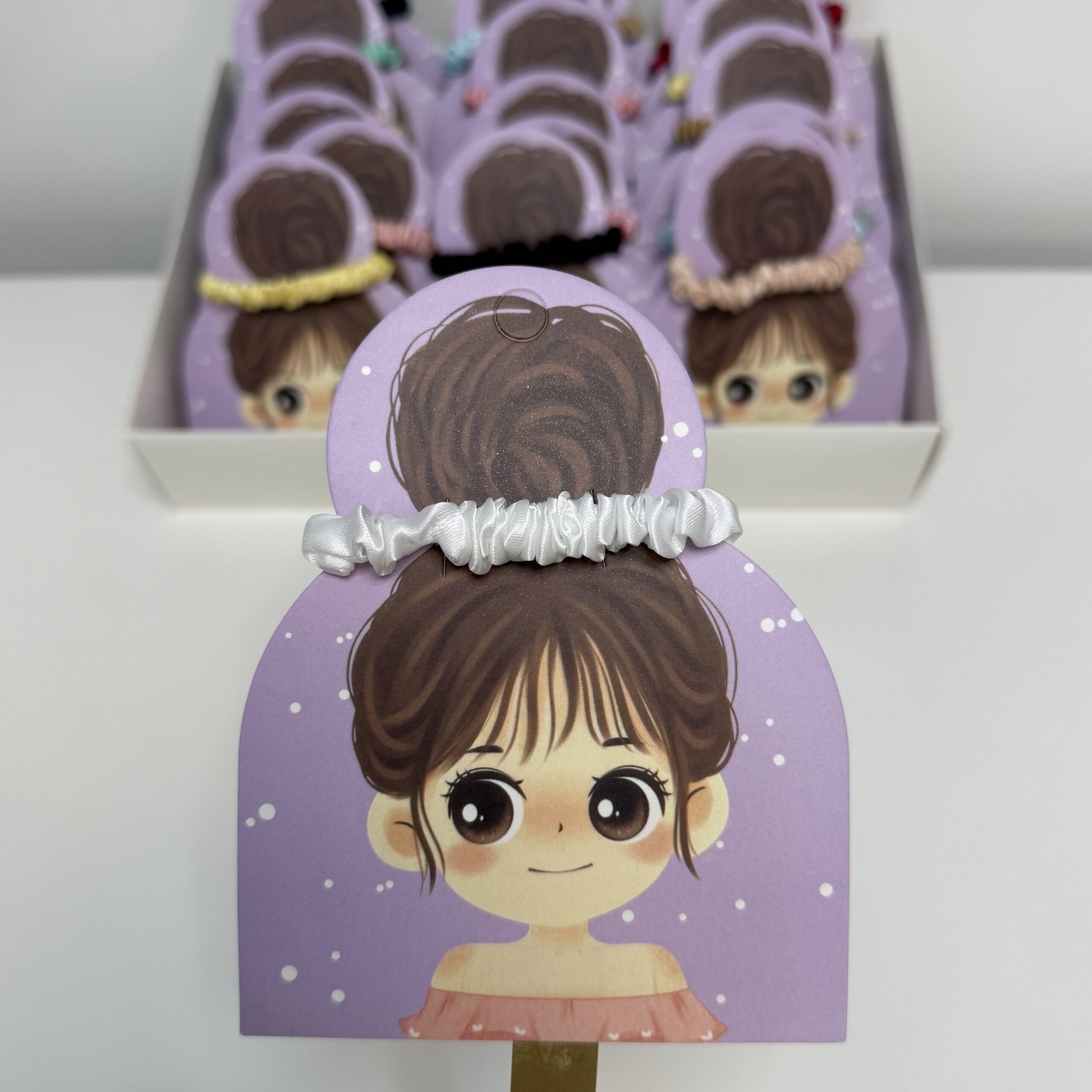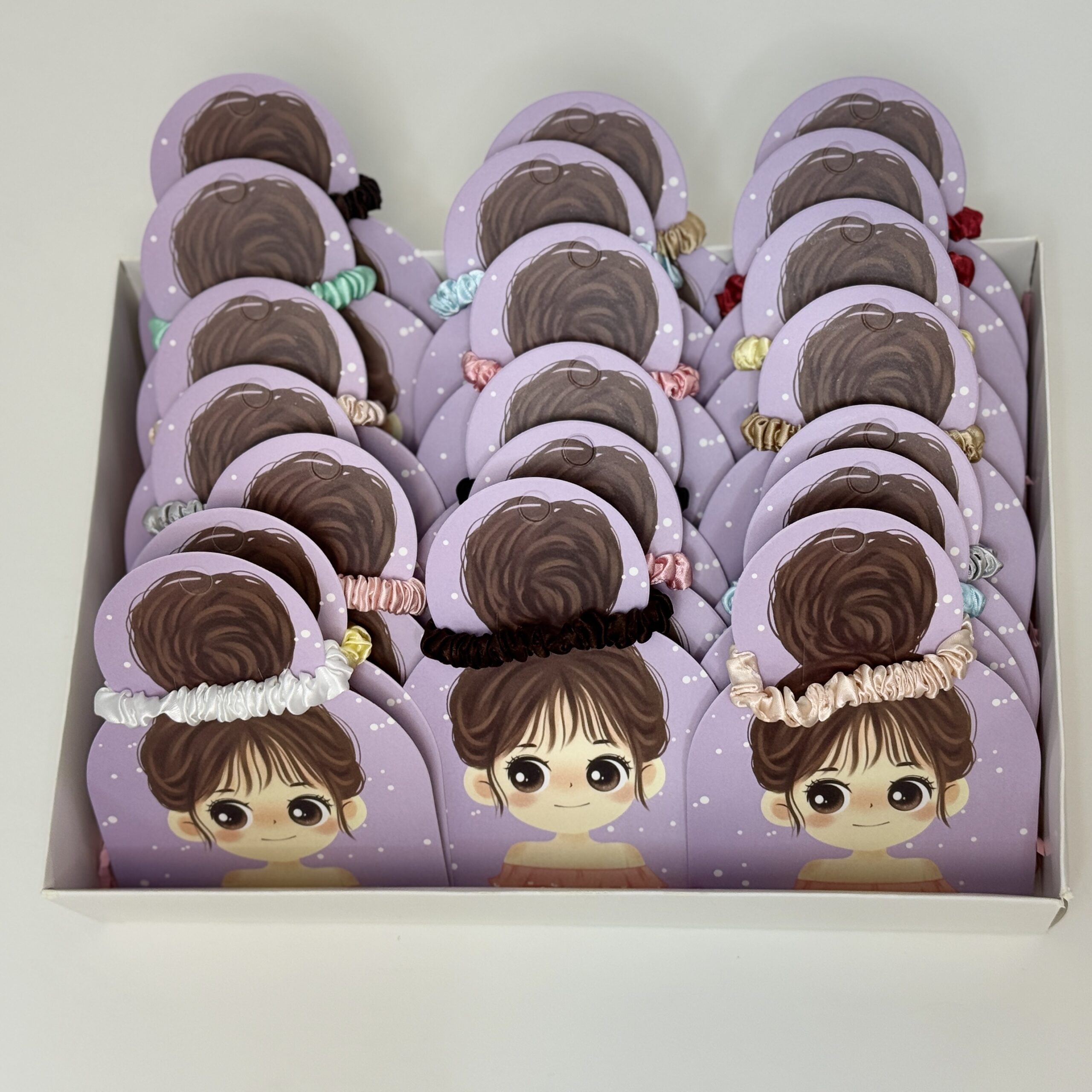 بوكس توزيعات أنيق يحتوي على 24 قطعة ربطة شعر قماشية بتصاميم وألوان ناعمة.