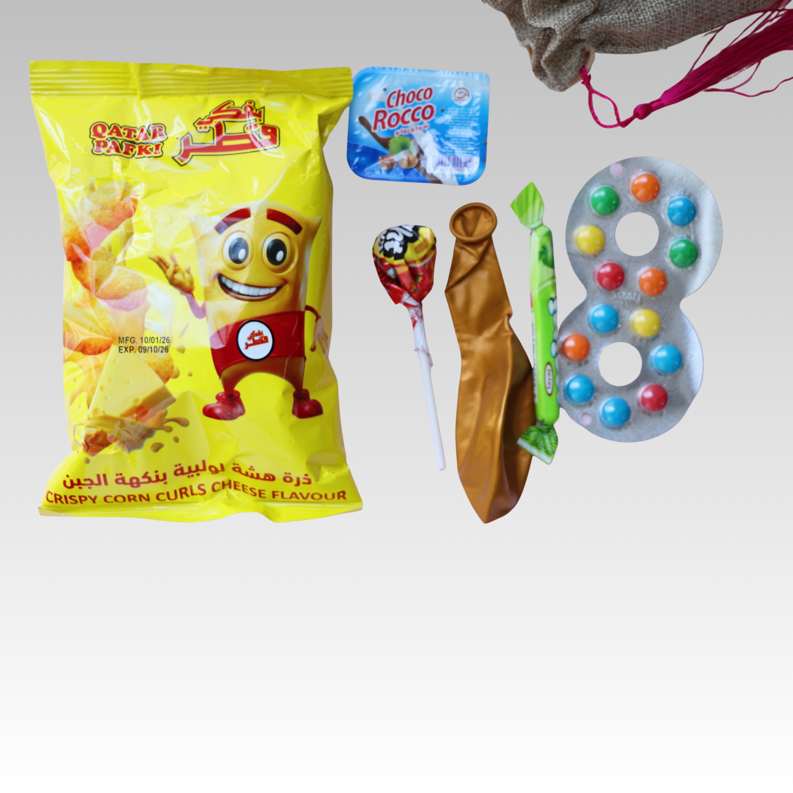 المحتويات : بطاطس بوفك قطر – شوكولاتة تشوكو روكو – حلاوة مصاص – بالونة – حلاوه جيلي طويله – حلاوة النظاره