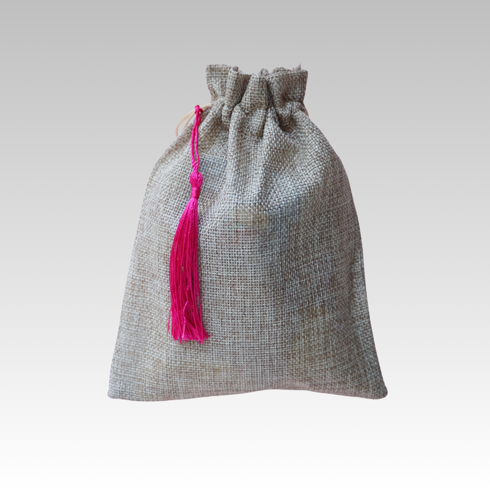 قرنقعوه بخامة خيش ولمسة تراثية بسيطة، مناسبة لتوزيعات القرنقعوه للأطفال، بخامة خفيفة مع رباط علوي للإغلاق، سهلة الحمل وآمنة للأطفال، وتُعد خيارًا عمليًا ومرتبًا لتقديم الحلويات خلال مناسبة القرنقعوه