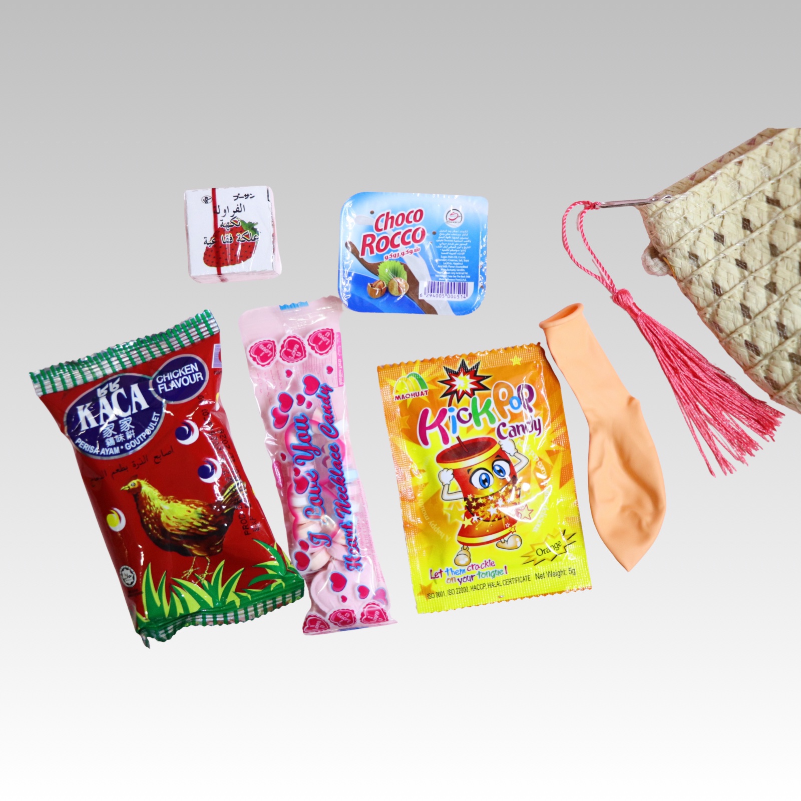 .المحتويات : بطاطس كاكا – حلاوة السلاسل – علك الفواكه– شوكولاتة تشوكو روكو – حلاوة المفرقعات– بالونة