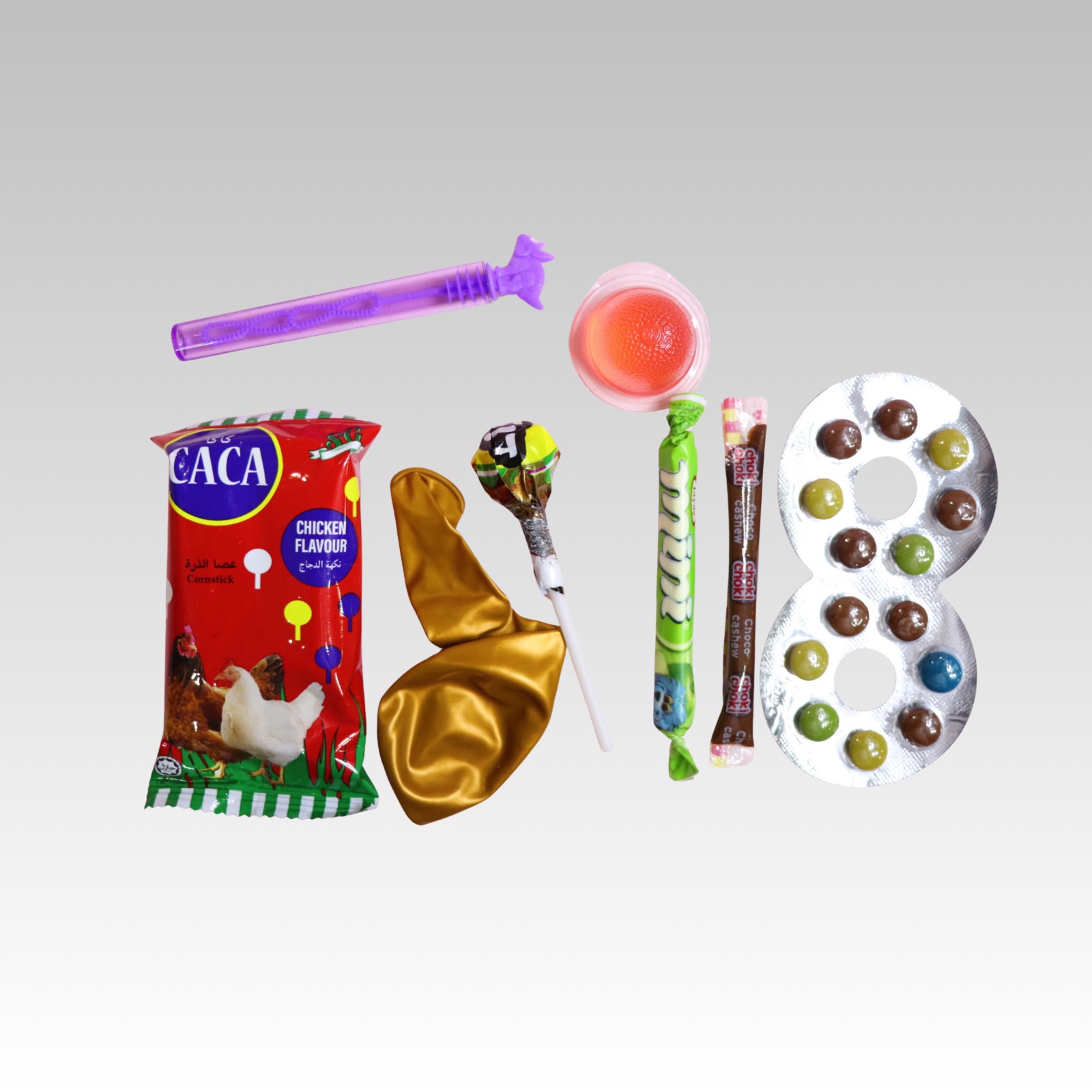 المحتويات : بطاطس كاكا – حلاوة مصاص – بالونة – شوكولاتة – جيلي طويل -حلاوة النظاره – جيلي – لعبة